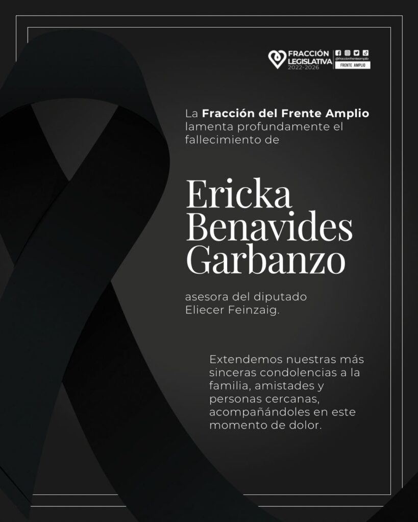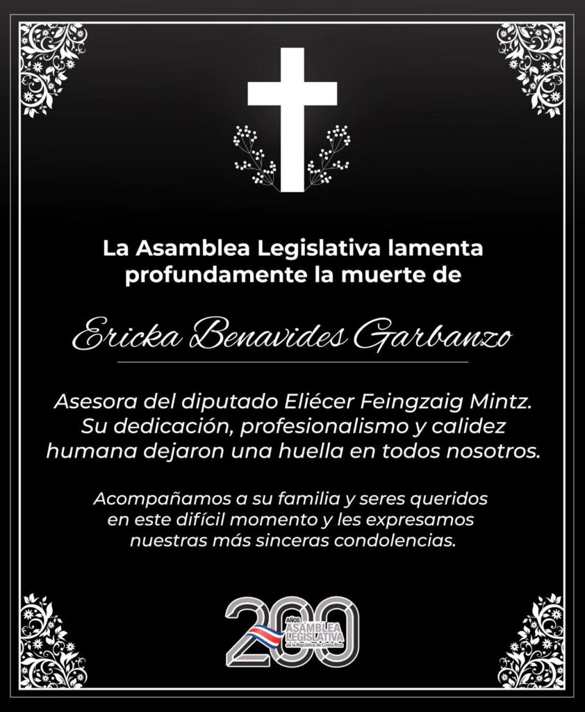 El Congreso de la República y diputados de varias fracciones legislativas lamentaron el fallecimiento de Ericka Benavides Garbanzo, asesora legislativa del diputado del Partido Liberal Progresista (PLP) y candidato presidencial, Eli Feinzaig.