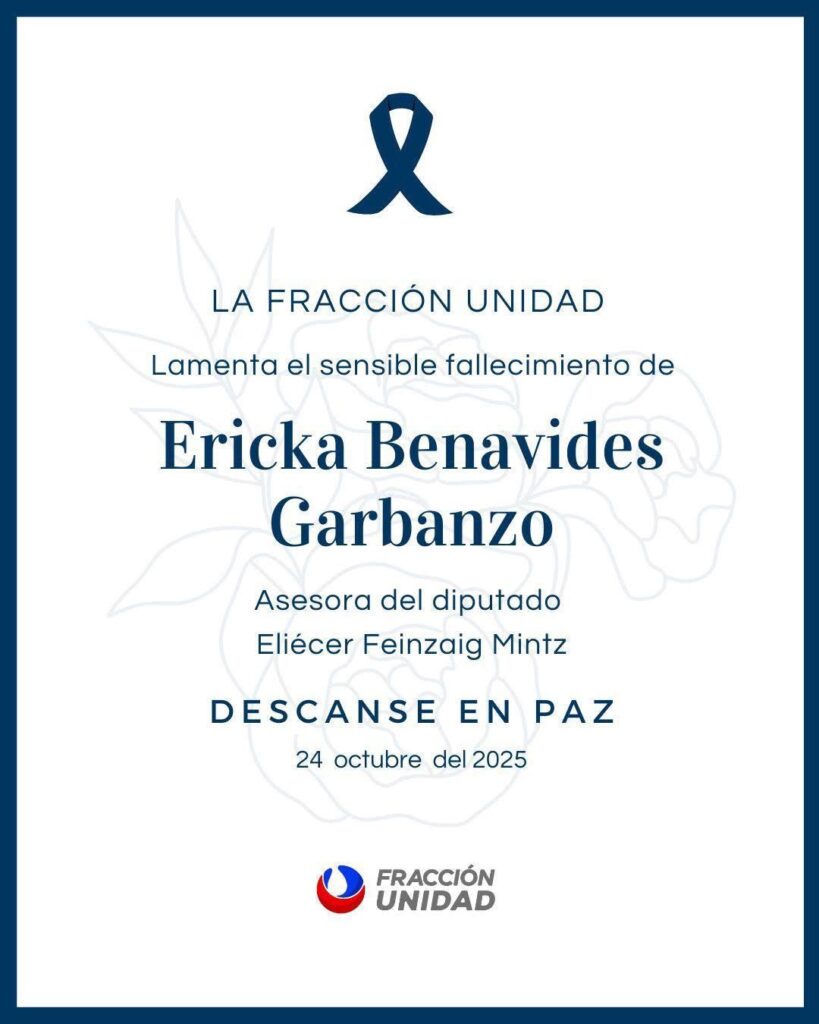 "La Fracción Unidad lamenta profundamente el fallecimiento de la señora Éricka Benavides Garbanzo, asesora del diputado Eliécer Feinzaig Mintz. Expresamos nuestras más sinceras condolencias a su familia, amistades y compañeros de trabajo en este difícil momento".