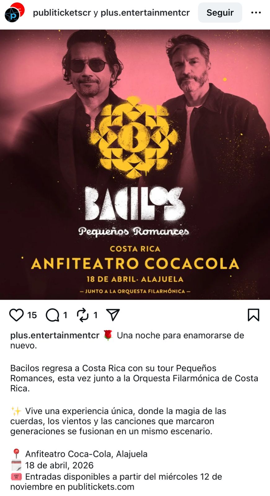 Bacilos ha tenido la oportunidad de visitar Costa Rica en distintas ocasiones. La última vez que compartieron su música con los ticos fue durante uno de los eventos más grandes del país, el PICNIC Festival, realizado a inicios de este año, donde conquistaron a cientos de asistentes con sus reconocidos éxitos.