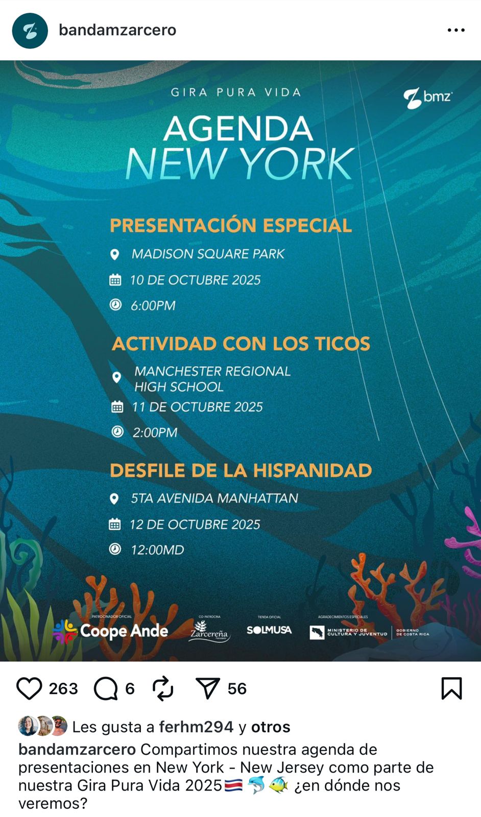 Cabe destacar que las presentaciones de la agrupación comenzarán este viernes con una actuación especial en Madison Square Park a las 6:00 p.m. Las actividades continuarán el sábado con un encuentro con costarricenses residentes en la zona en Manchester Regional High School a las 2:00 p.m., y finalmente la banda se lucirá por las calles de la Quinta Avenida en Manhattan a las 12:00 p.m.