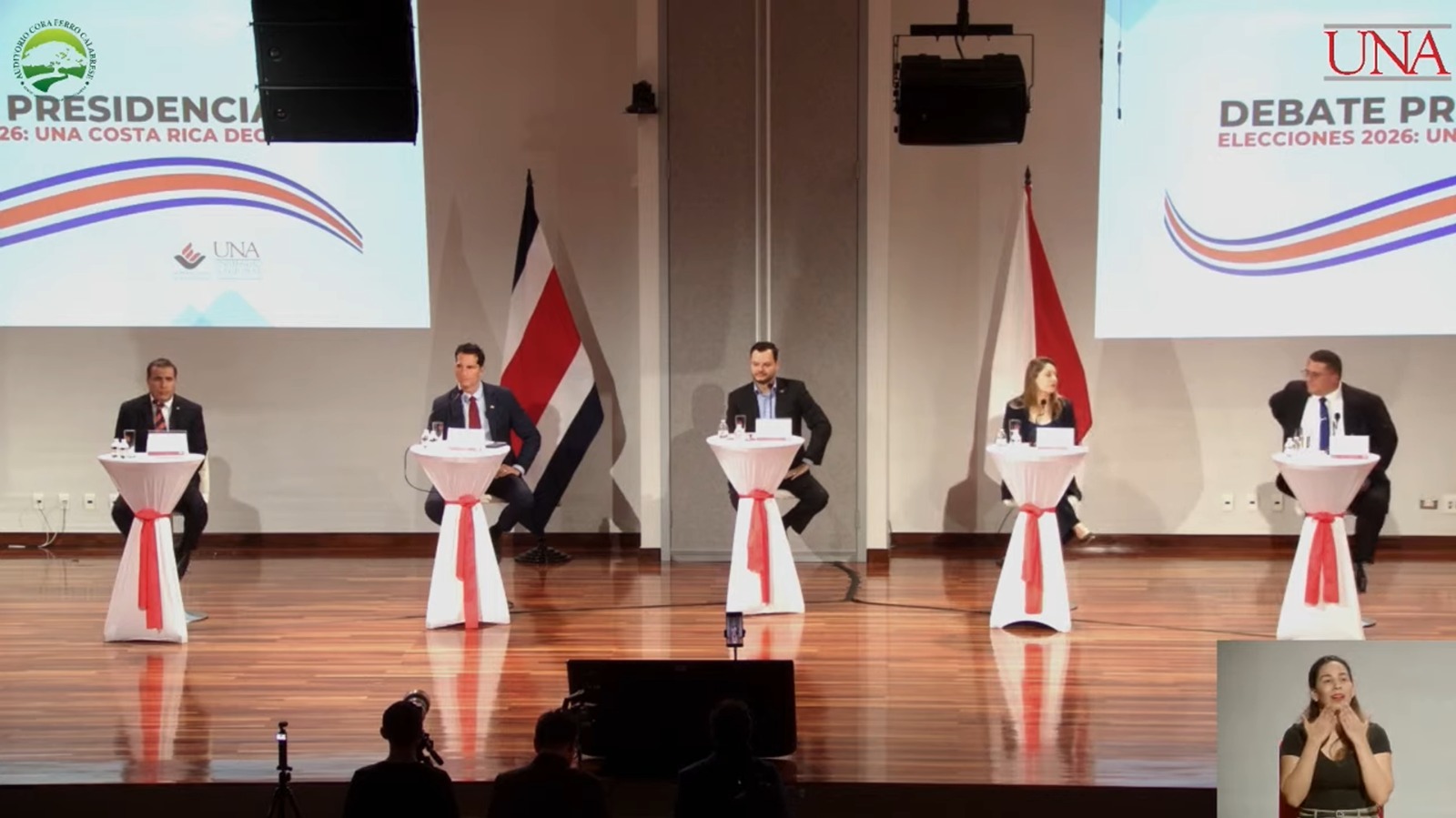 Fernando Zamora, candidato por el Partido Nueva Generación; José Aguilar, de Avanza; Juan Carlos Hidalgo, del PUSC; Claudia Dobles, de Agenda Ciudadana, y Boris Molina, del Partido Unión Costarricense Democrática, en el debate de este miércoles en la UNA. Captura de pantalla