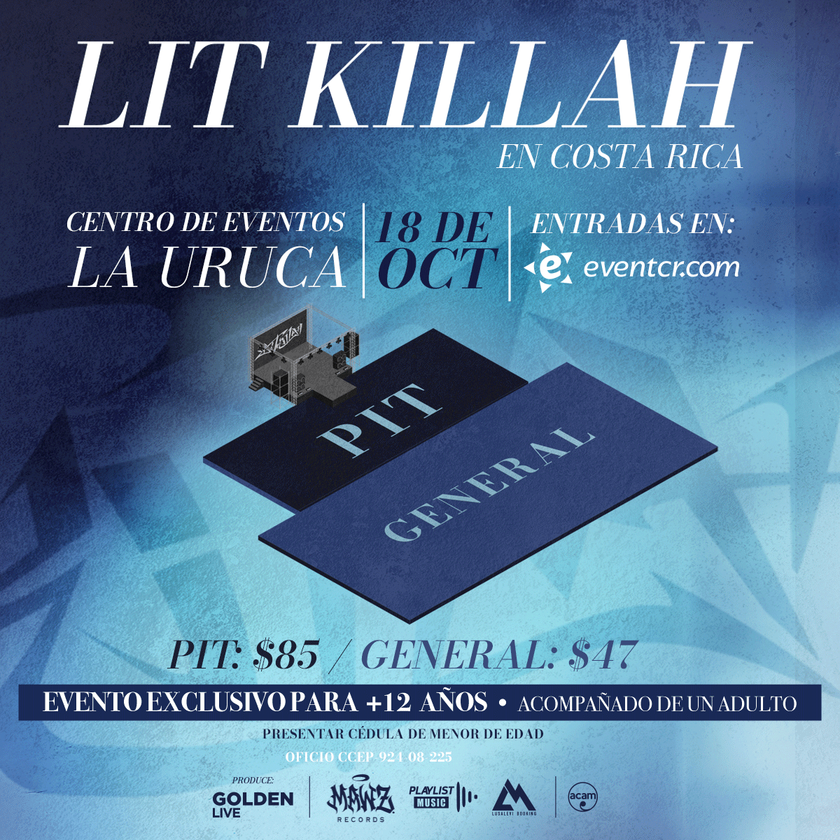 "Queremos que nadie falte a este primer concierto de Lit Killah en Costa Rica. Por eso invitamos a todos los mayores de 12 años a vivir una noche llena de energía y conexión con el artista", comentó Susan Madriz, directora de Golden Live, empresa productora del evento.