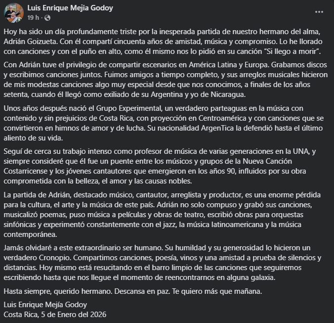 El reconocido artista nicaragüense Luis Enrique Mejía Godoy compartió un sentido y emotivo mensaje con el que despidió no solo a un colega de trayectoria, sino a quien consideró un hermano del alma: Adrián Goizueta.