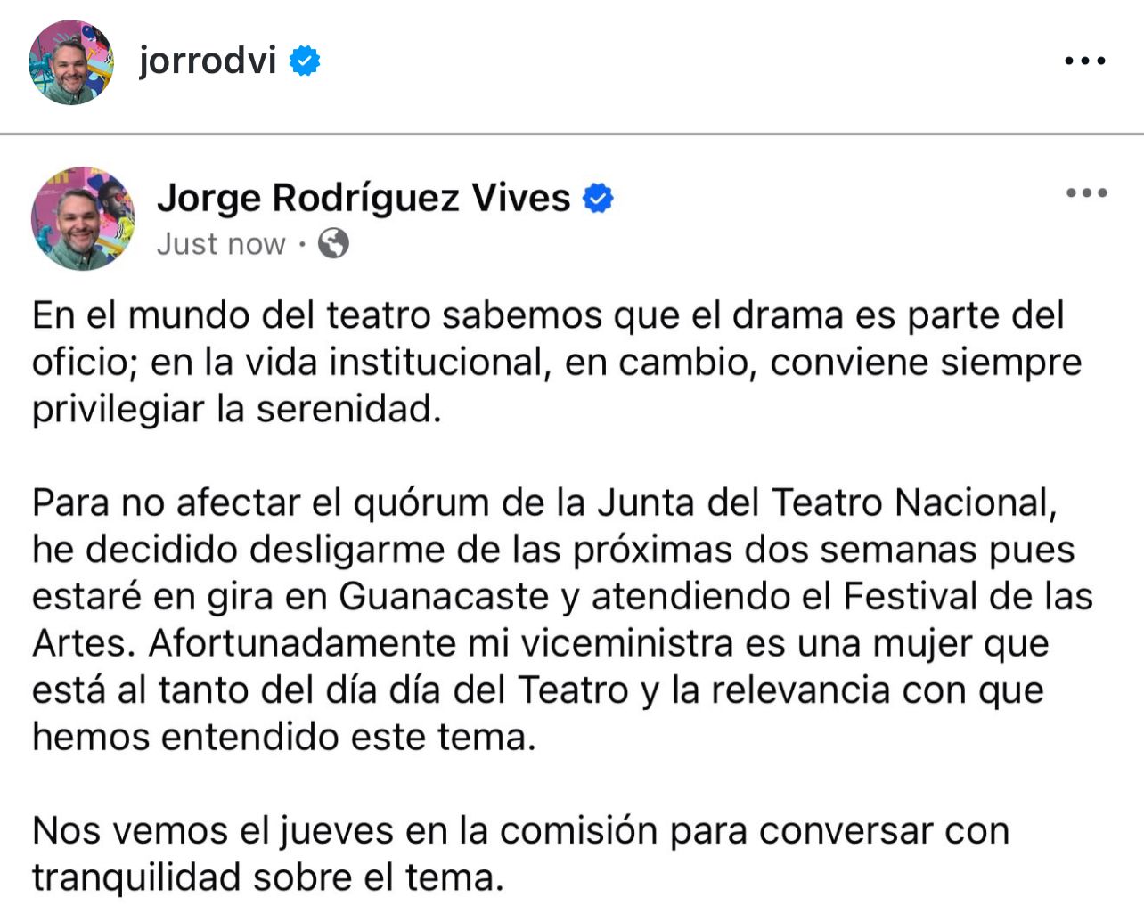 El ministro de Cultura y Juventud, Jorge Rodríguez, emitió un mensaje en sus redes sociales luego de darse a conocer su renuncia al Consejo Directivo del Teatro Nacional de Costa Rica, en medio de la crisis que enfrenta el inmueble por presuntos daños irreparables.
