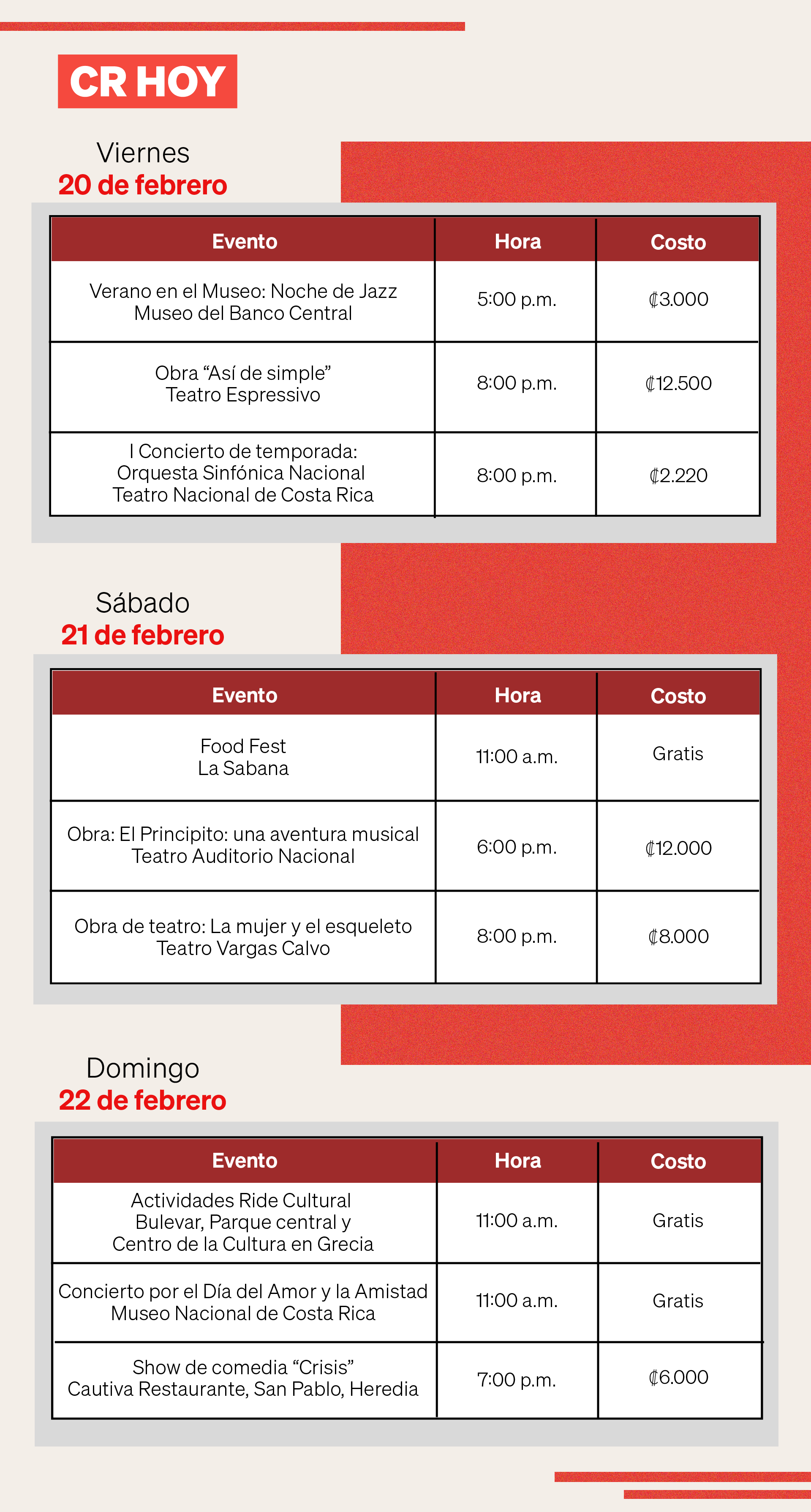 ¿Disfrutaron del fin de semana pasado? Si fue así, le contamos que el que se aproxima promete aún más. Como cada semana, presentamos la agenda cultural de CR Hoy, con actividades seleccionadas especialmente para usted. Así que prepare las palomitas y póngase cómodo, porque desde ya comenzamos el recorrido.