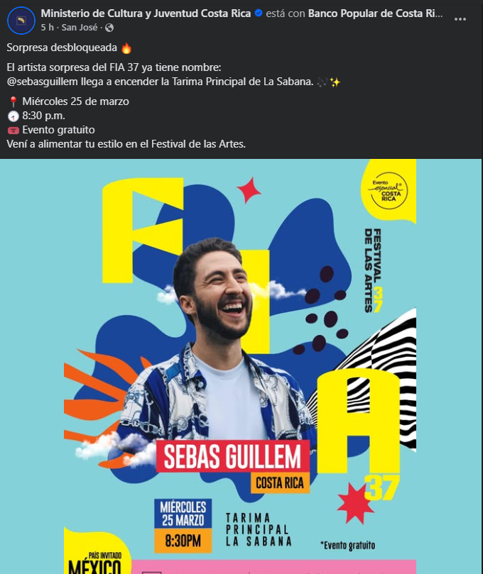 El músico costarricense Sebas Guillem será el artista sorpresa que el Festival Internacional de las Artes (FIA) traerá para su edición número 37.