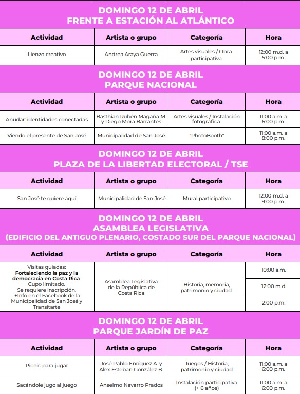El disfrute del arte continúa. Desde las 12:00 p. m., se desarrollarán diversas expresiones artísticas en distintos sectores de Transitarte, donde el público podrá apreciar el trabajo de artistas costarricenses e incluso participar en la creación de un mural, con el fin de estimular la creatividad.