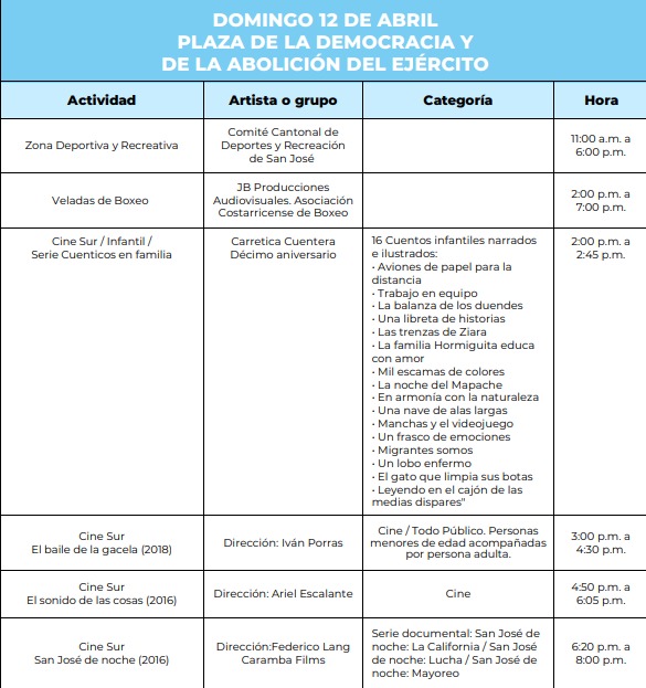 El calypso se apoderará del inicio de este domingo con una presentación que llenará la capital de sabor caribeño. Por otra parte, la banda Chiqui chiqui pondrá el ritmo para que todos salgan a bailar. La tarima del swing será una de las más destacadas de la jornada, ya que ofrecerá actividades tanto para quienes se inician en este género como para los más experimentados.