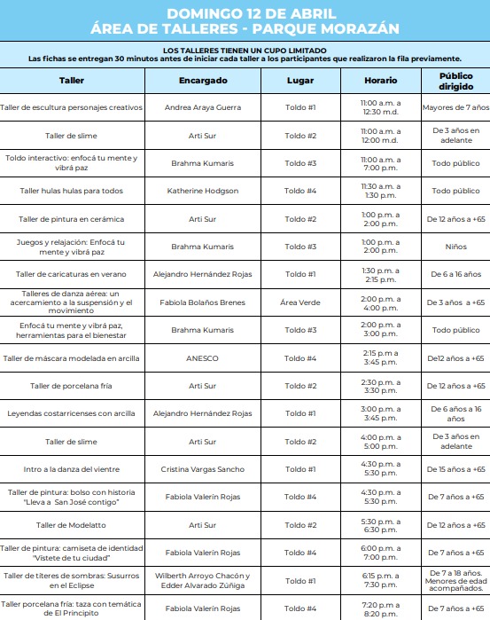 Para que los más pequeños de la casa inicien la semana con toda la energía, no pueden perderse los talleres que se desarrollarán este domingo en el Parque Morazán. Habrá actividades como pintura en cerámica e incluso una introducción a la danza del vientre, ideales para quienes deseen aprender nuevos ritmos.