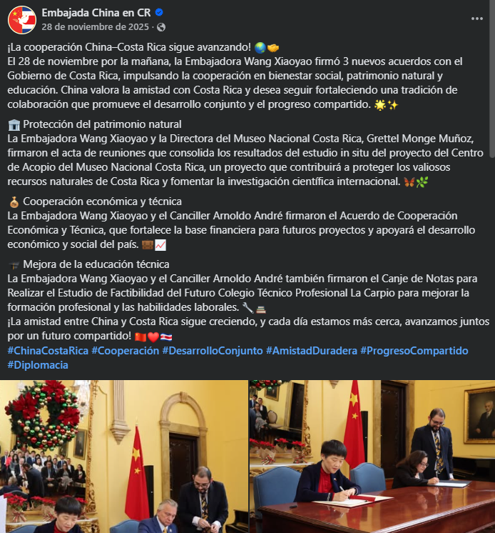 Tras el anuncio realizado en 2023, no se volvió a tener información pública sobre el avance del proyecto hasta noviembre de 2025, cuando la Embajada de China en Costa Rica divulgó fotografías en las que se evidenciaba la firma de tres nuevos acuerdos orientados a impulsar el bienestar social, el patrimonio cultural y la educación.