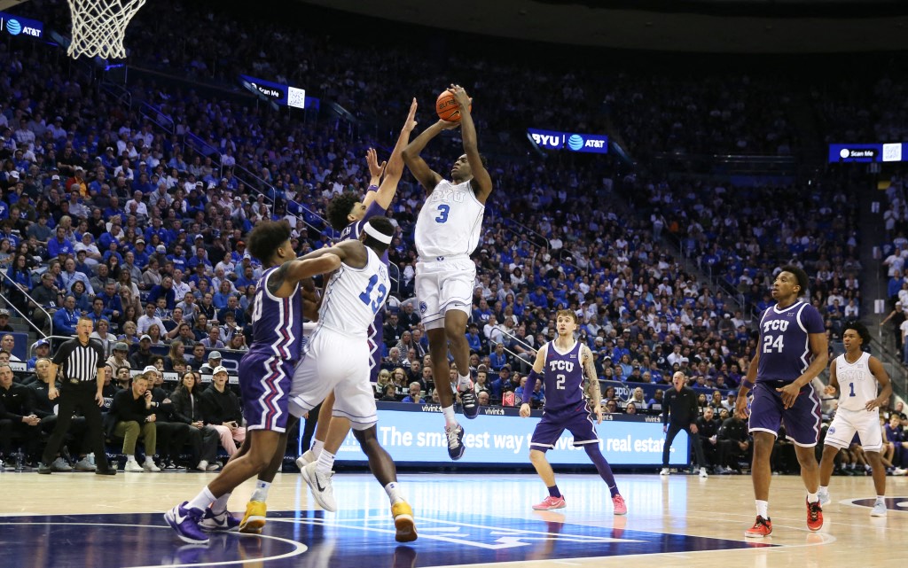 AJ Dybantsa #3 de los Brigham Young Cougars lanza por encima de David Punch #15, Jace Posey #00, Brock Harding #2 y Xavier Edmonds #24 de los Texas Christian University Horned Frogs durante la segunda mitad en el Marriott Center el 14 de enero de 2026 en Provo, Utah. AFP