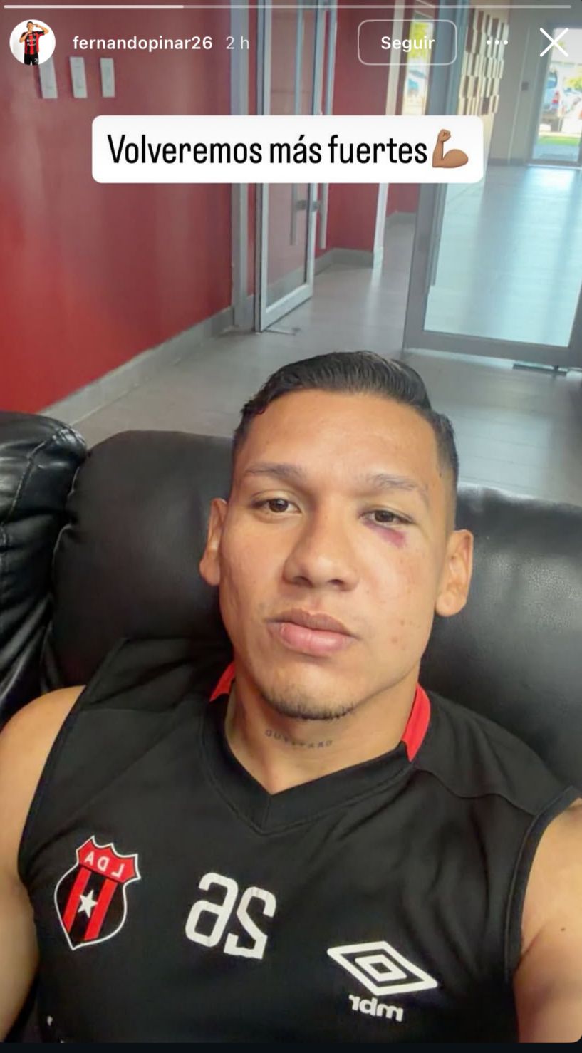 El lateral de Alajuelense, Fernando Piñar, mostró mediante una fotografía el estado de su rostro tras el codazo recibido por parte del delantero de Saprissa, Orlando Sinclair, en el Clásico del sábado.