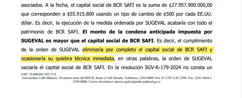 De acuerdo con los argumentos presentados al tribunal, el capital social de BCR SAFI ronda los ₡27.957 millones, por lo que cumplir con esa obligación provocaría la pérdida total de sus recursos y, en consecuencia, una disolución inmediata de la administradora.