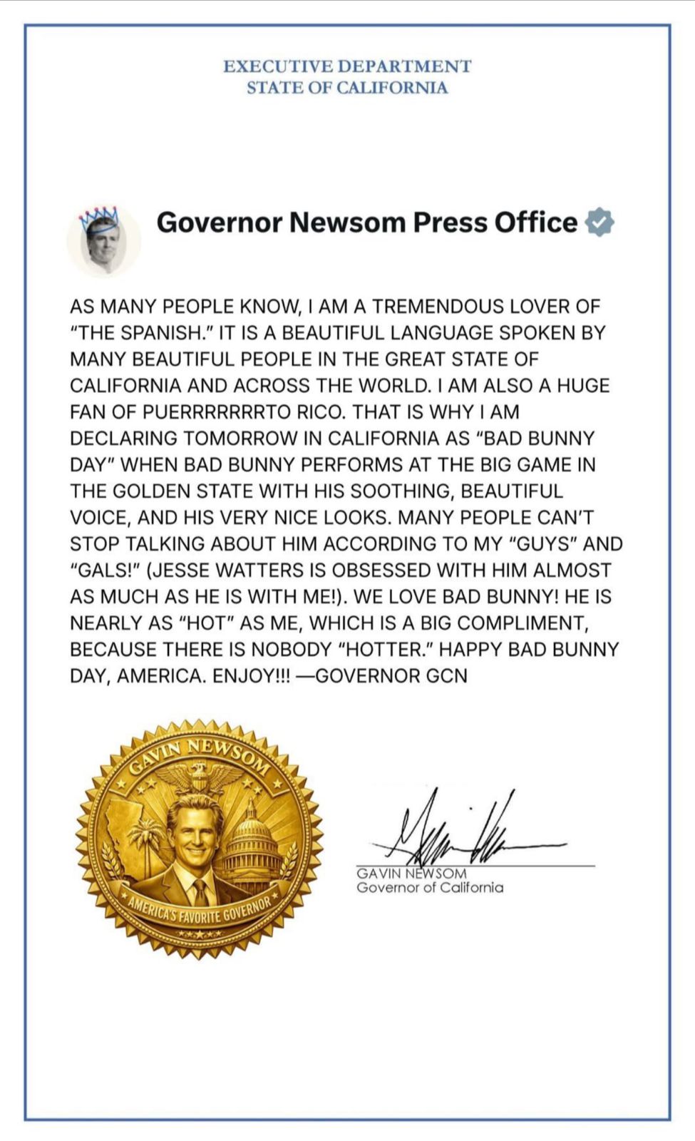 Estoy declarando oficialmente mañana en California como el Día de Bad Bunny, cuando Bad Bunny actúe en el gran juego en el Golden State, con su voz relajante y hermosa, y su muy buen aspecto, expresó el gobernador a través de la red social.
