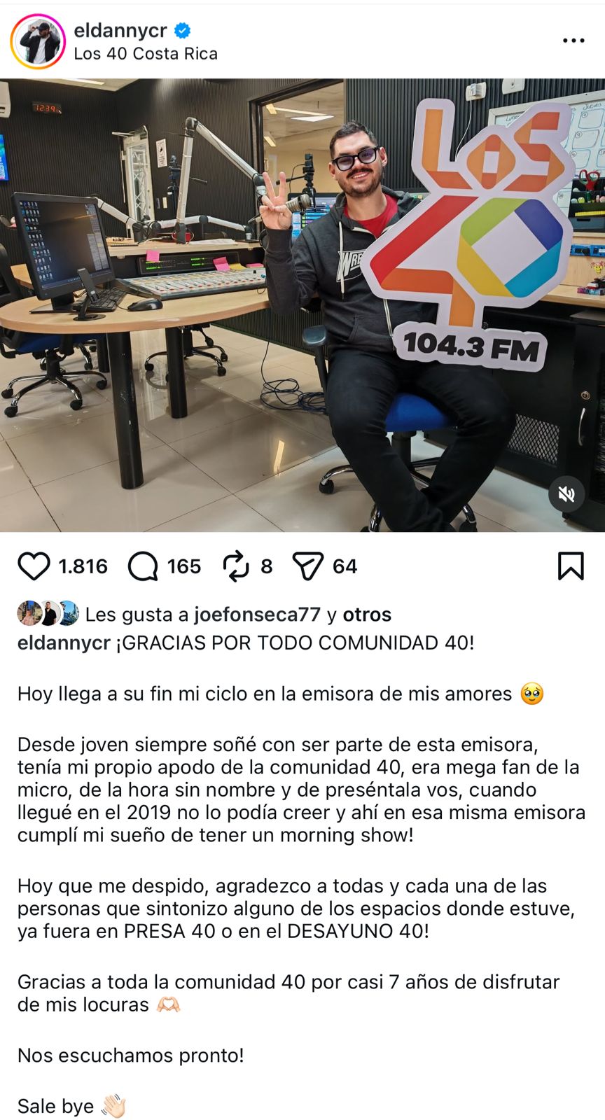Con sentido mensaje El Danny CR se despide de emisora Los 40