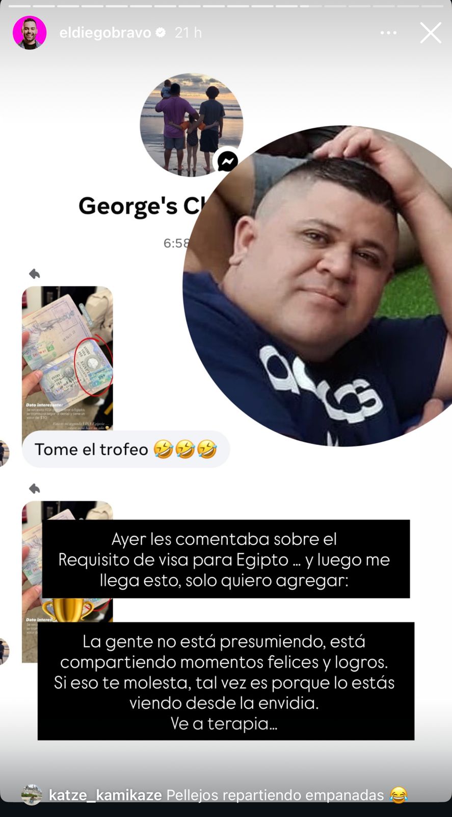 Bravo compartió una imagen en la que se observa cómo un usuario llamado "George" le respondió "Tome el trofeo" a una historia en la que el creador de contenido explicaba que para ingresar a Egipto se necesitaba visa.