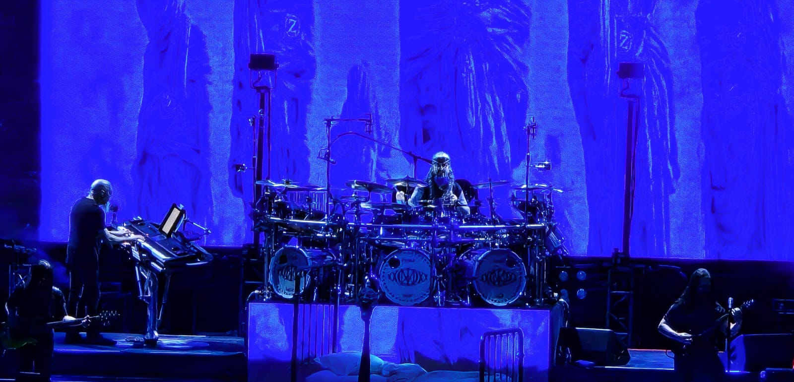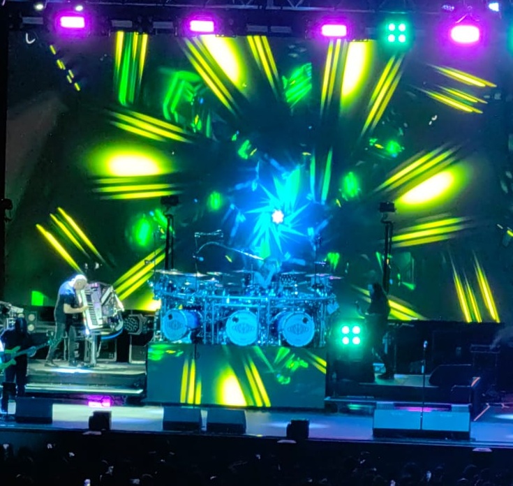 En el plano formal, el concierto apostó por un montaje sencillo, sobrio. Desde luego, la descomunal batería de Portnoy dominaba la escena: el elemento más protagónico (qué delicioso exceso que tenga tres bombos; el que puede, puede). Al fondo, una pantalla proyectaba visuales de carácter ilustrativo, alusivos a cada pieza, lo suficientemente nutritivos para redondear la experiencia, pero sin recargarla ni distraer de los ejecutantes.