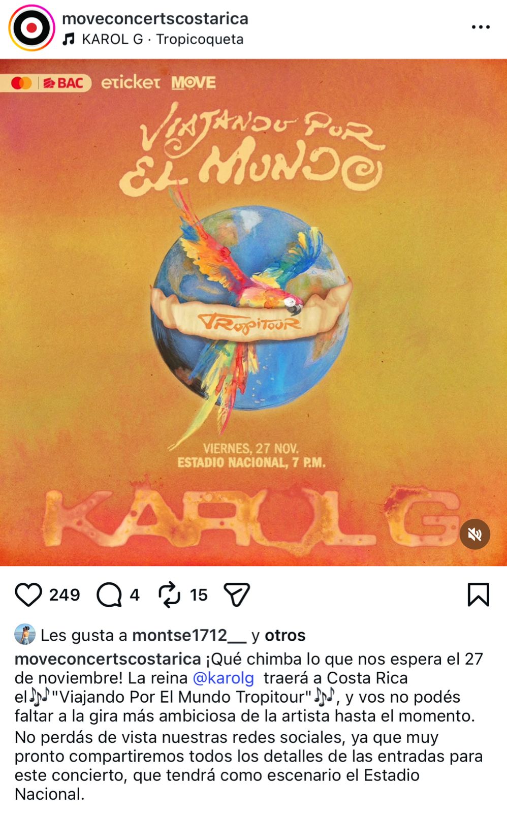 La reconocida cantante colombiana Karol G oficialmente realizará concierto en Costa Rica como parte de su nueva gira Viajando por el mundo tropitour.