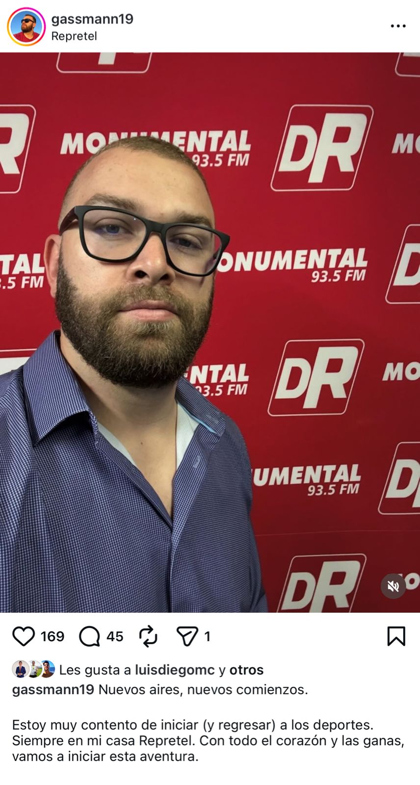 Gasmann, quien dirigió la radio Exa FM, dio a conocer la noticia a través de sus redes sociales, donde compartió una imagen con el logo de DR (Deportes Repretel) de fondo, acompañada de un mensaje en el que destacó que esta nueva etapa representa nuevos aires y comienzos en su carrera.