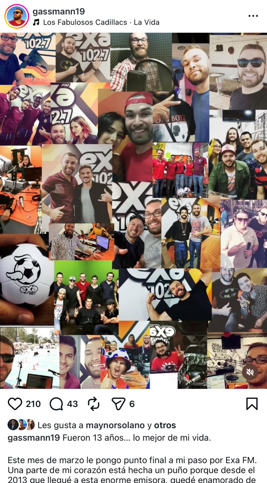 El anuncio llega luego de que, días atrás, informara por medio de sus redes sociales que, tras 13 años, dejaba de formar parte del equipo de Exa FM. Gassman aseguró que una parte de su corazón se encontraba "hecha un puño", ya que desde 2013, cuando llegó a la emisora, quedó profundamente enamorado de todo lo que vivió en ese proyecto.