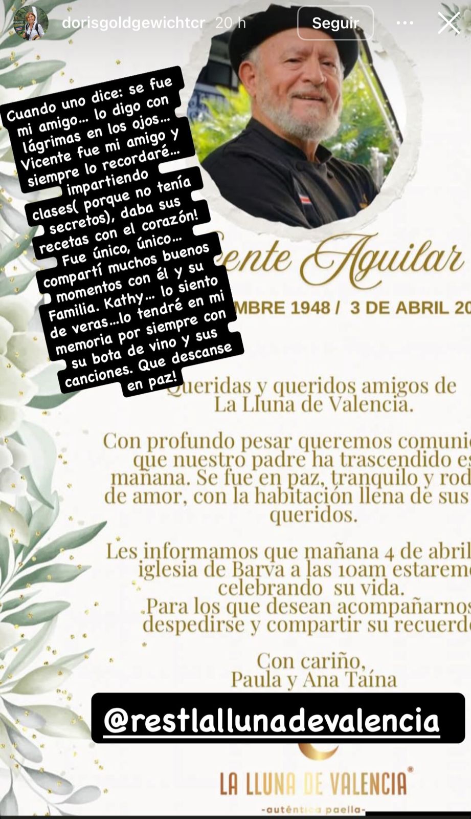 El reconocido músico costarricense Humberto Vargas fue otro de los que no dudó en recordar el legado del español con un sentido mensaje, en el que destacó que se acabaron las "cantadas" junto a Aguilar. Además, aseguró que le duele en el alma su partida, pero que le dejó muchos aprendizajes y momentos que atesora.
