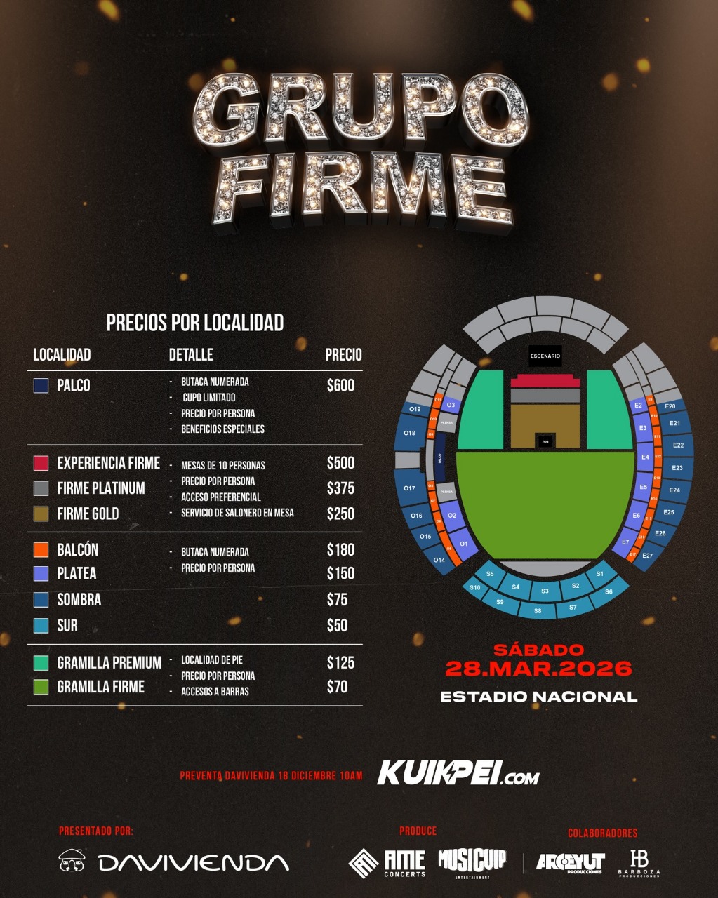 La agrupación de música regional mexicana Grupo Firme confirmó que llegará a Costa Rica el próximo año para deleitar a los costarricenses con su música. Con el anuncio, también se dieron a conocer los precios de las localidades disponibles para este evento.