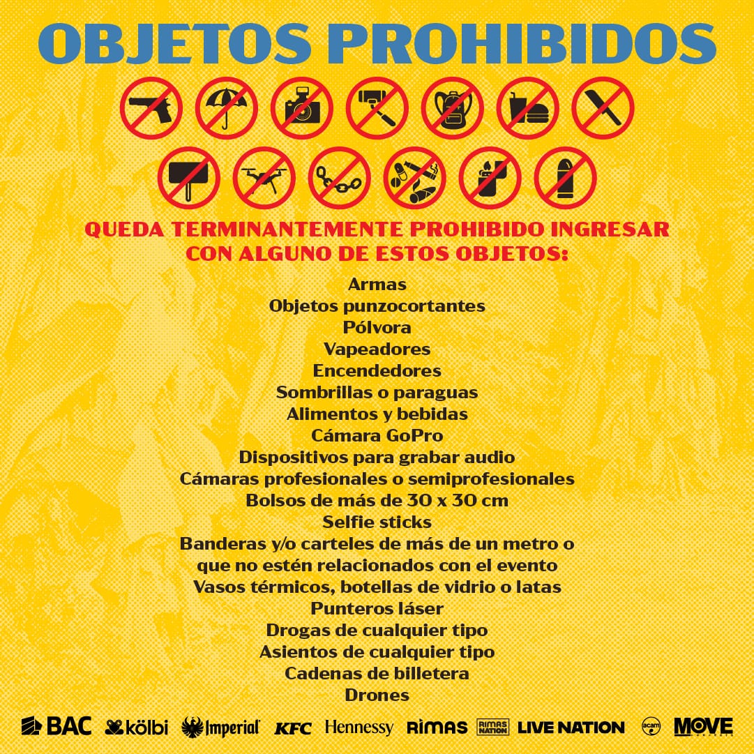 Tome en consideración la lista de objetos que están prohibidos de ingresar al recinto.