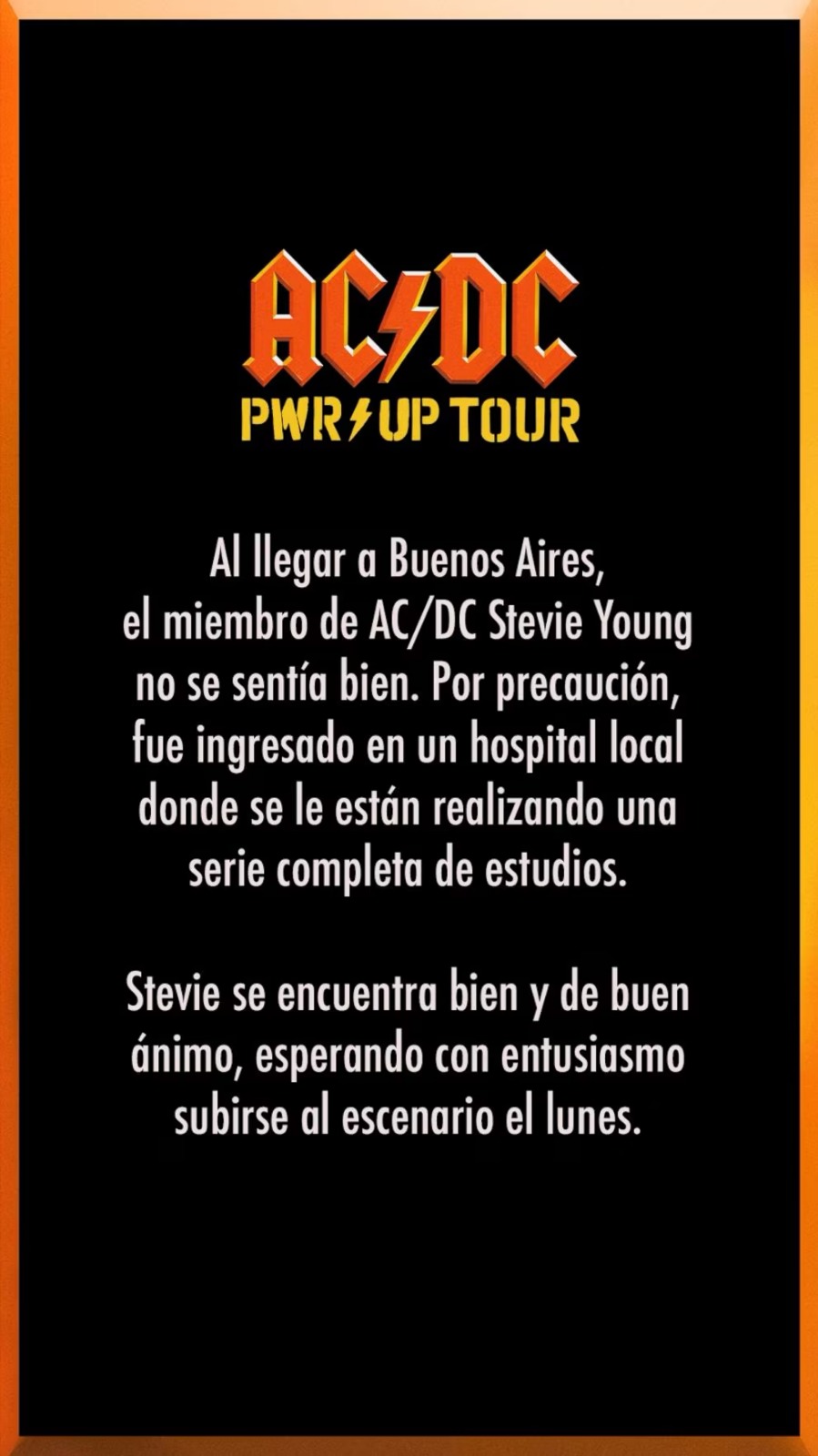 Además, se destacó que, de momento, el músico se encuentra bien e incluso de buen ánimo. La agrupación se encuentra en Argentina debido a que tiene tres conciertos programados en el estadio River Plate, como parte de su gira Power Up Tour, la cual también llegará a países como Chile y México.