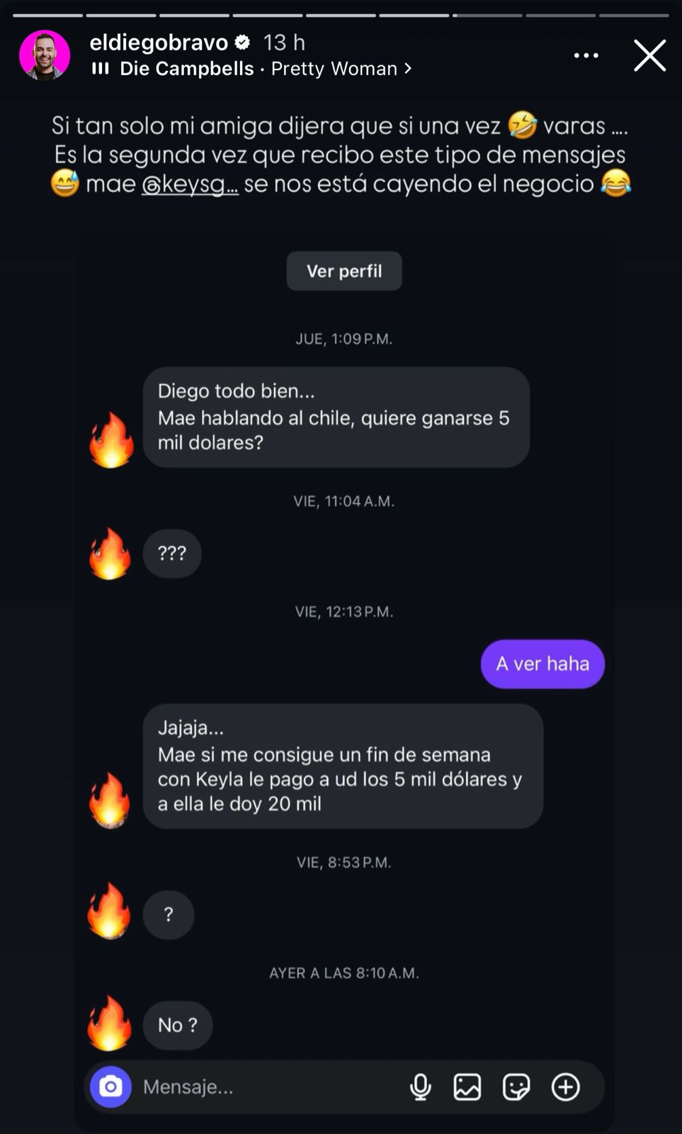 Diego, mae, hablando al chile, ¿quiere ganarse 5 mil dólares? Si me consigue un fin de semana con Keyla, le pago a usted los 5 mil dólares y a ella le doy 20 mil, mencionó el usuario en el mensaje.