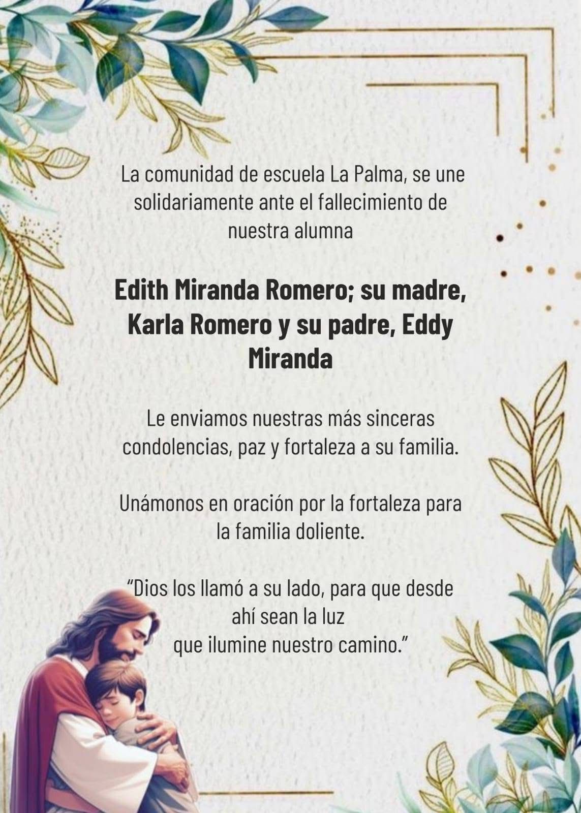 "La comunidad de escuela La Palma, se une solidariamente ante el fallecimiento de nuestra alumna Edith Miranda Romero; su madre, Karla Romero y su padre, Eddy Miranda. Le enviamos nuestras más sinceras condolencias, paz y fortaleza a su familia. Unámonos en oración por la fortaleza para la familia doliente", escribieron.