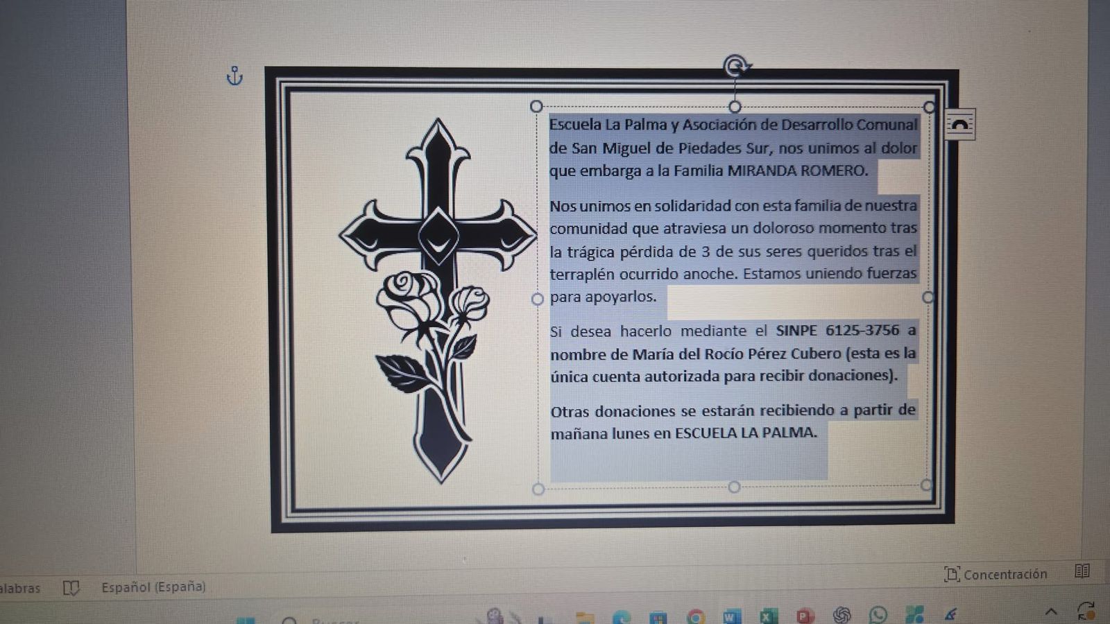 "Nos unimos en solidaridad con esta familia de nuestra comunidad que atraviesa un doloroso momento tras la trágica pérdida de 3 de sus seres queridos tras el terraplén ocurrido anoche. Estamos uniendo fuerzas para apoyarlos.
