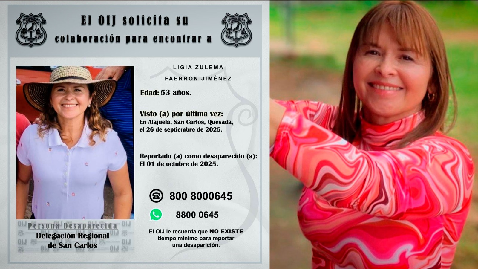 Esta mañana, las autoridades realizaron un allanamiento en una finca ubicada en Florencia de San Carlos como parte de la investigación por la desaparición de Ligia Zulema Faerron Jiménez. La propiedad pertenece a la madrastra del sujeto que fue visto por última vez con el vehículo de la mujer.