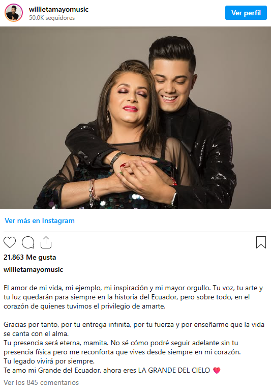 Por otra parte, su hijo, Willie Tamayo, también dedicó emotivas palabras a su madre: "Tu presencia será eterna, mamita. No sé cómo podré seguir adelante sin tu presencia física, pero me reconforta que vives desde siempre en mi corazón. Tu legado vivirá por siempre. Te amo, mi Grande del Ecuador; ahora eres la Grande del Cielo", escribió a través de sus redes sociales.