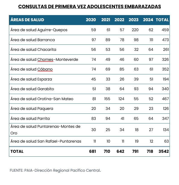La Dra. Karolina Montero, psicóloga clínica del Programa de Atención Integral a la Adolescencia de la Dirección de Red de Servicios de Salud de la región Pacífico Central (Drisspc), indicó que durante el período 2020-2024 se reportó un total de 3.542 adolescentes embarazadas, siendo Barranca (473) y Aguirre-Quepos (459) las zonas que muestran las cifras más considerables.