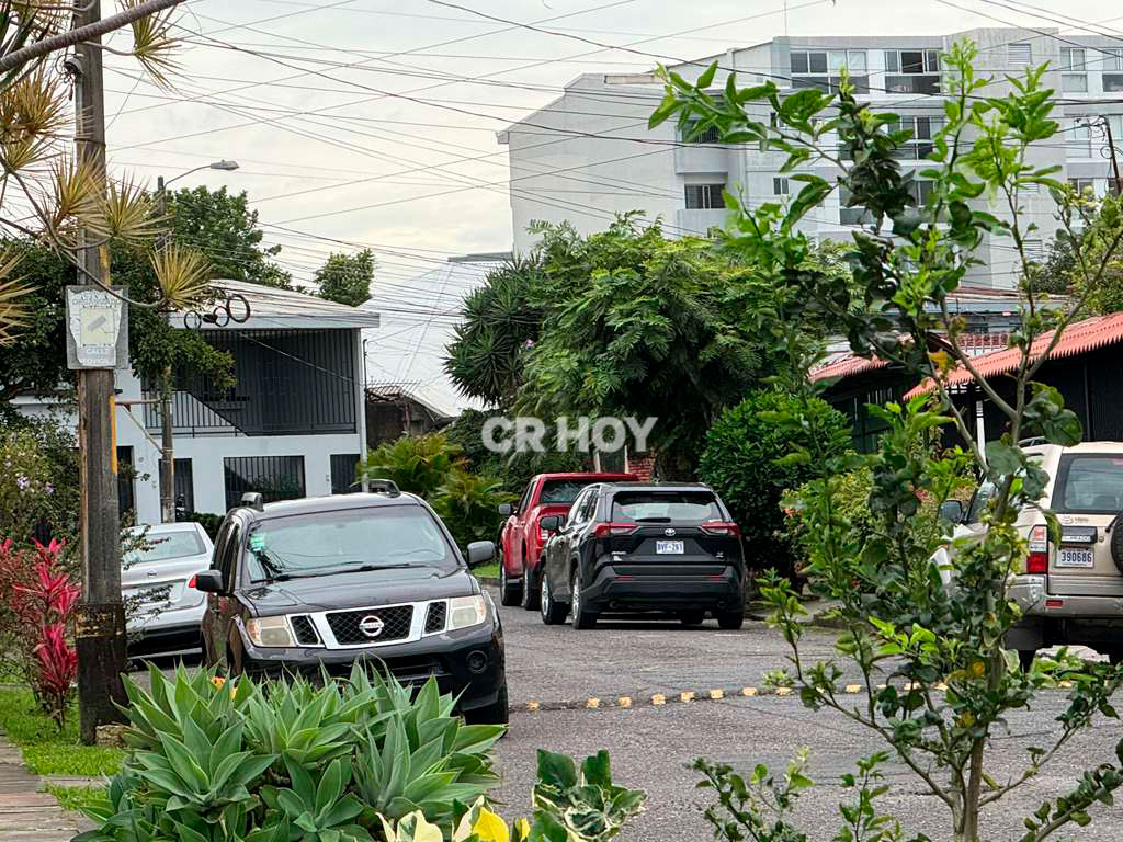 Agentes del Organismo de Investigación Judicial (OIJ), en conjunto con oficiales de la Fuerza Pública, mantienen cerrada la calle transversal 86A en Barrio Cristal de La Uruca, mientras allanan la vivienda de Randall Zúñiga, director de la institución, como parte de una investigación por varios casos de presunta violación.