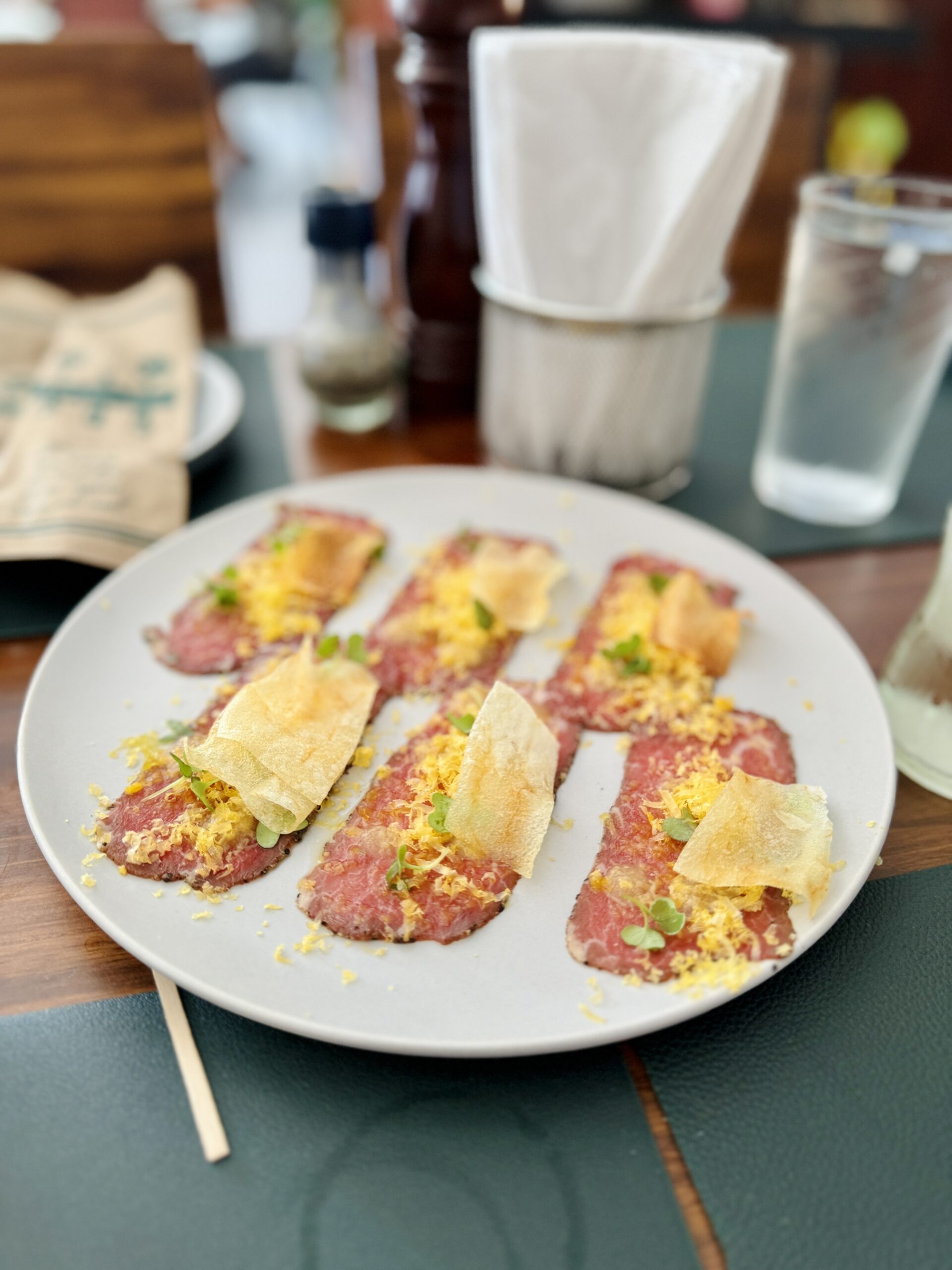 Carpaccio de wagyu: Láminas finas de wagyu con jalea de cebolla lactofermentada, yema cruda y chips crujientes. Equilibrio entre grasa, acidez y textura.