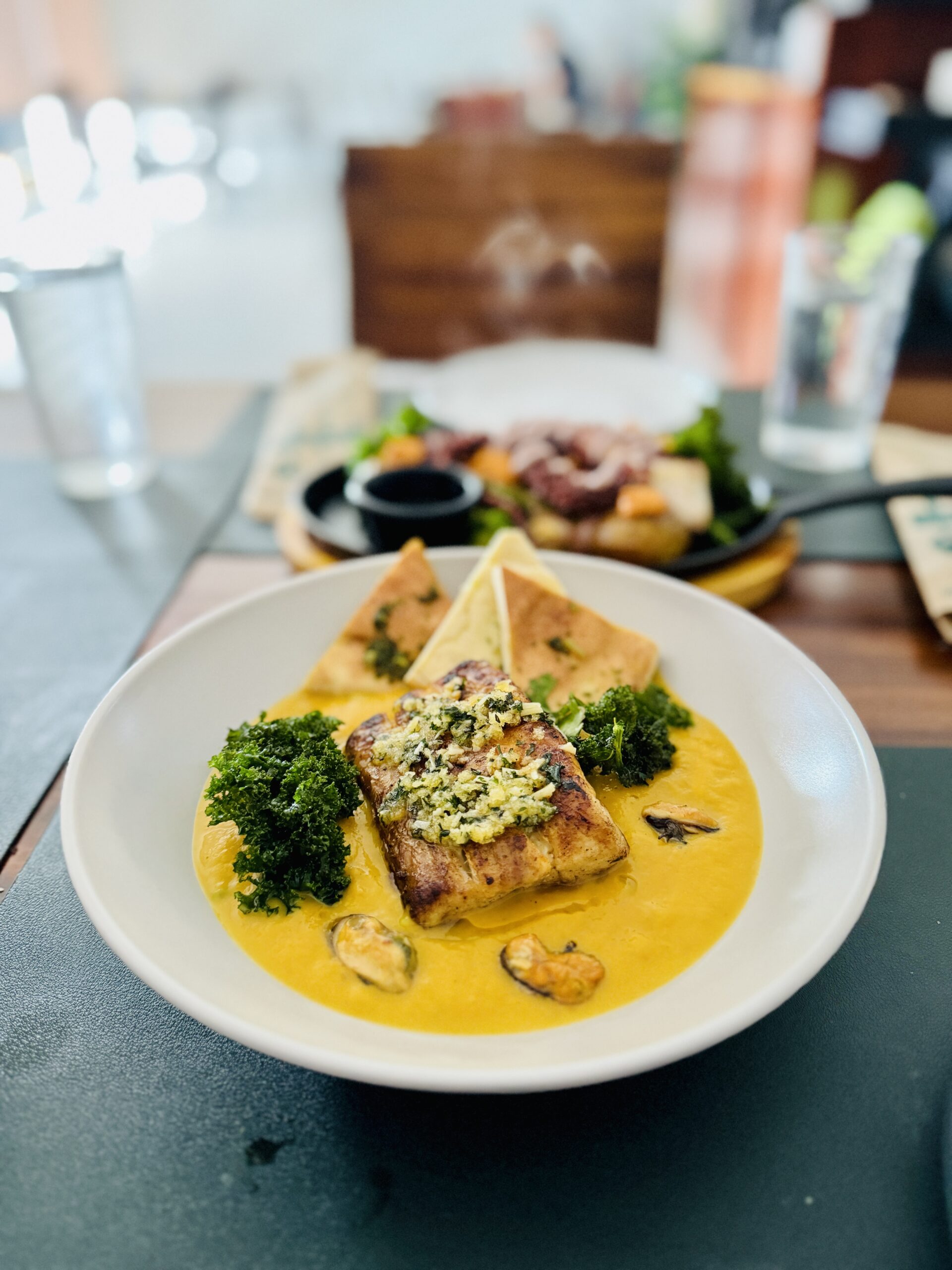 Mahi mahi en costra de hierbas: Filete de mahi mahi con costra de hierbas, servido con crema de ayote, mantequilla y mejillones al ajillo. Un plato delicado, bien armado y muy representativo de la propuesta del restaurante.