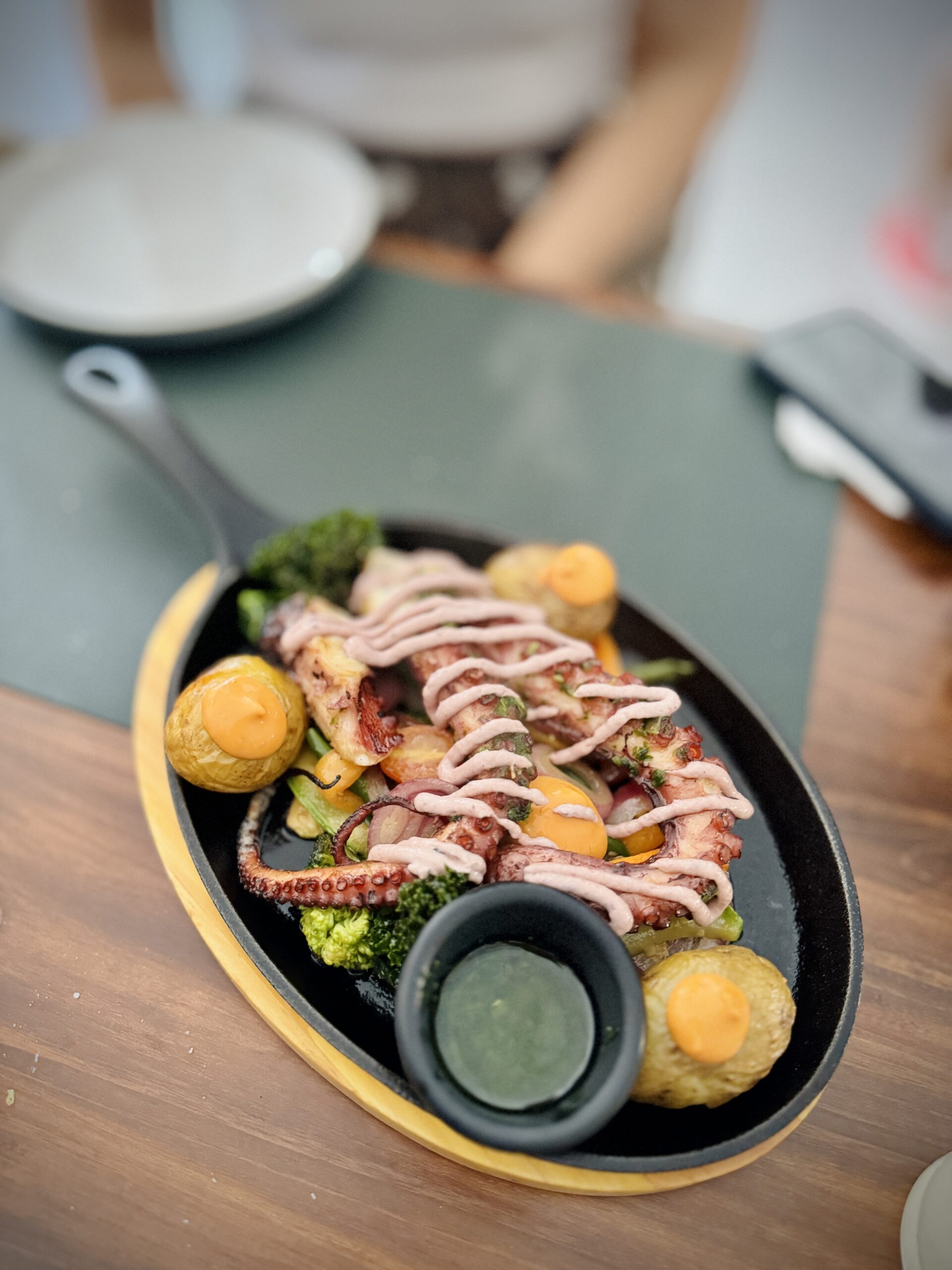 Pulpo español a la parrilla: Pulpo bien marcado a la parrilla, servido con gajos de papa, sobre una cama de verduras y acompañado de salsa tapenade. Punto preciso y sabor limpio.