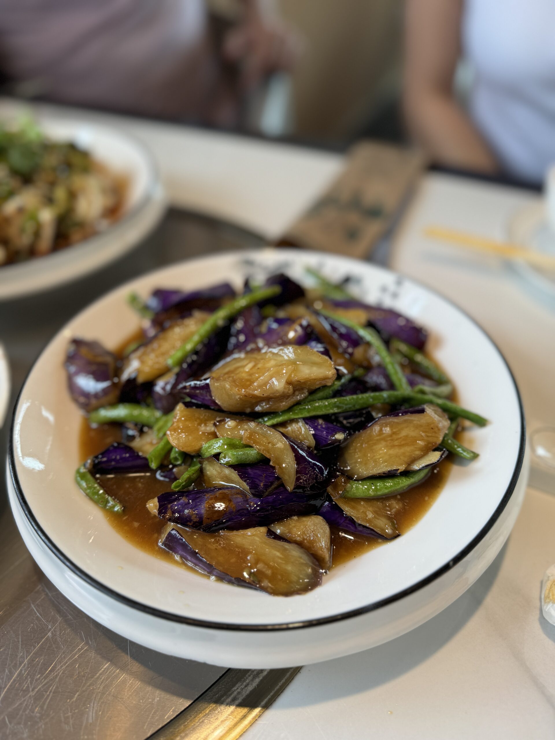 Berenjena con vainica china: La berenjena, bien trabajada, absorbe la salsa y se vuelve suave y casi cremosa por dentro. Combinada con vainica china aporta textura y contraste. Es un plato vegetal que no se siente secundario, sino protagonista, especialmente por la profundidad de la salsa.