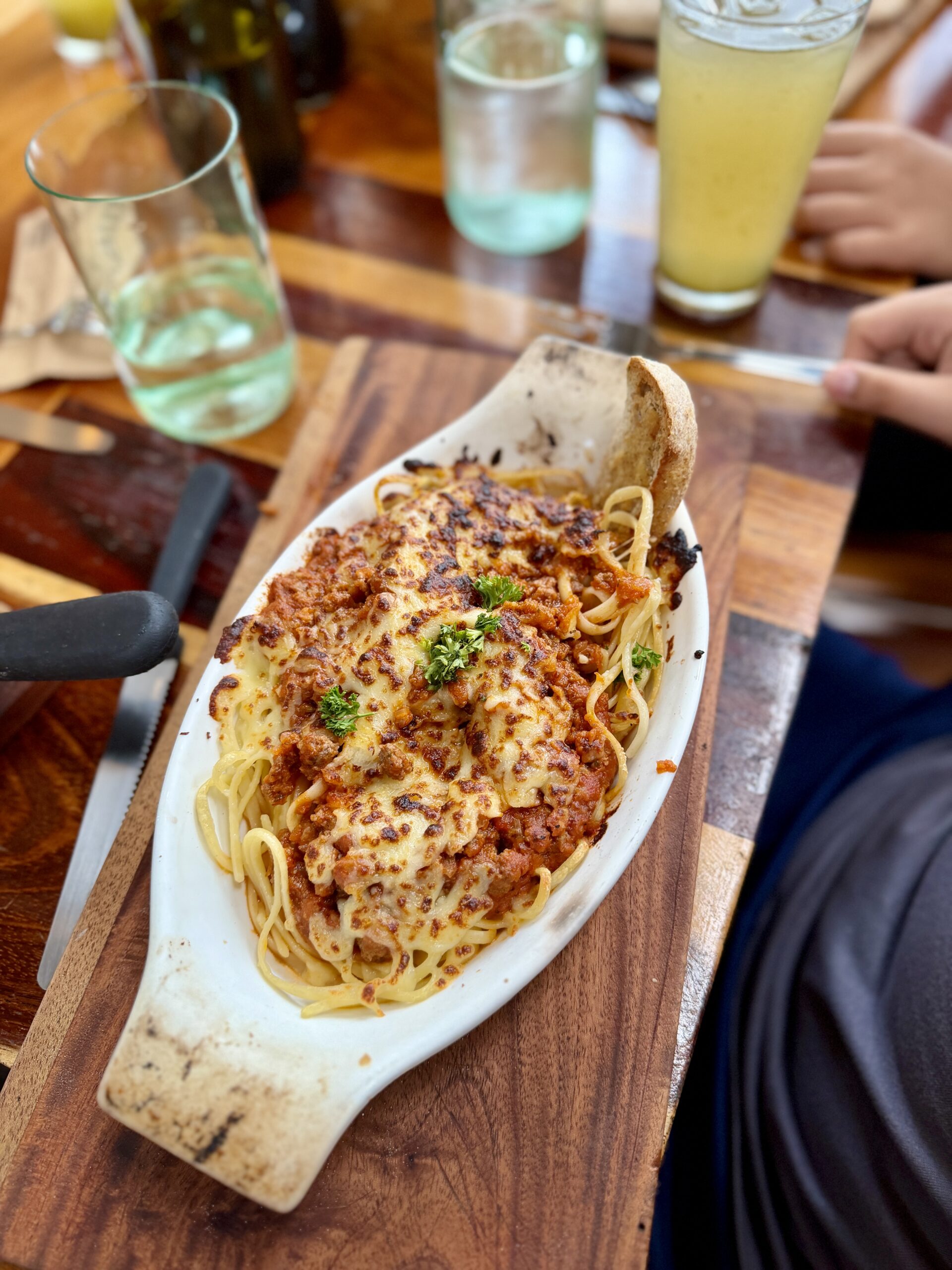 Linguini alla bolognesa: El clásico italiano hecho con carácter costarricense. Pasta fresca cocinada al punto exacto, acompañada de un ragú de carne que combina res y cerdo en cocción lenta, tomates naturales, vino tinto y hierbas del jardín. La salsa se adhiere a cada hebra de pasta con una densidad ideal, y el toque final de queso grana padano redondea un plato profundo y reconfortante.