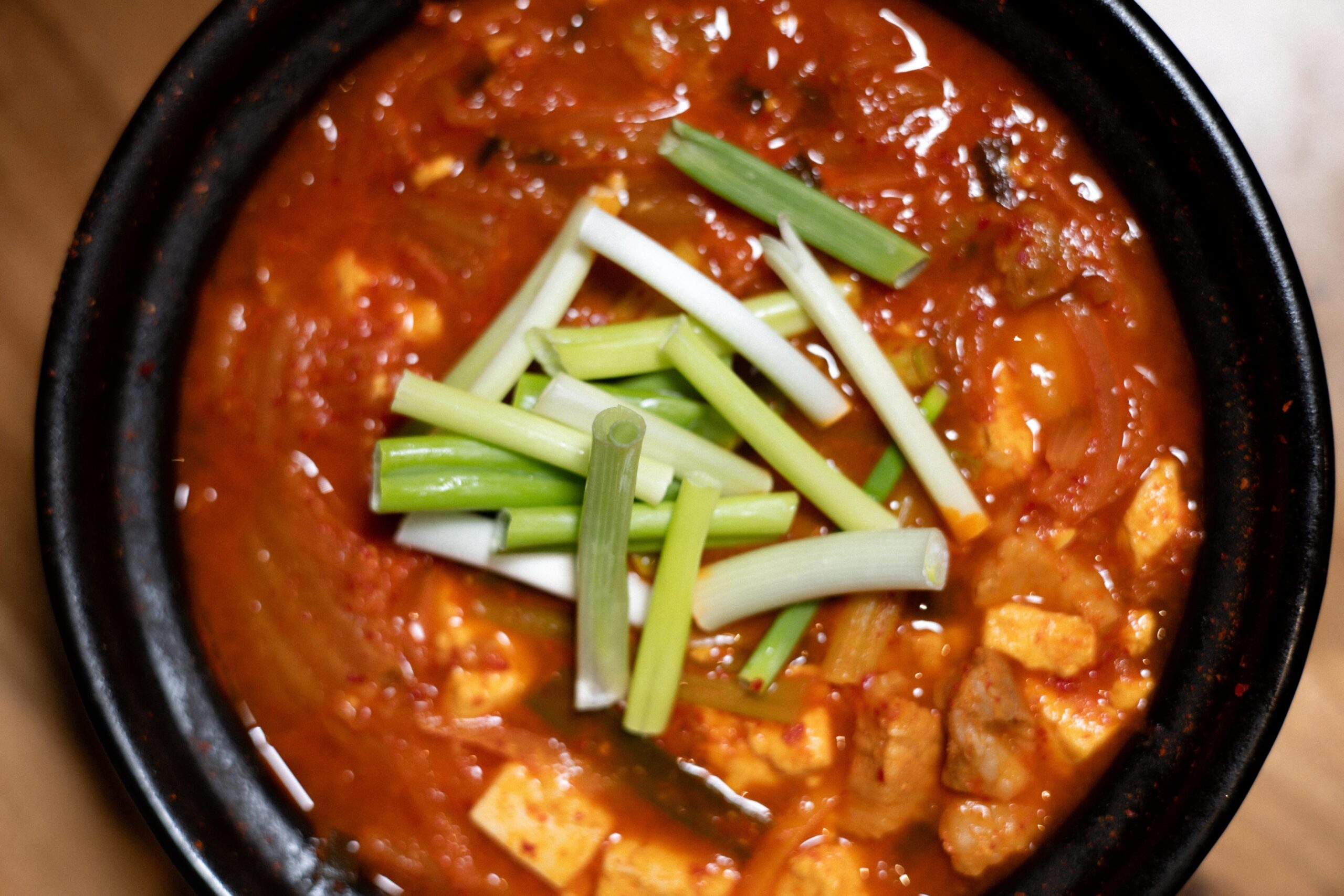 Kimchijjigae: Uno de los platos más representativos de Corea. Este estofado caliente a base de kimchi fermentado tiene profundidad, picante y ese sabor intenso que reconforta. Lleva tofu, vegetales y usualmente cerdo, y llega burbujeando a la mesa.
