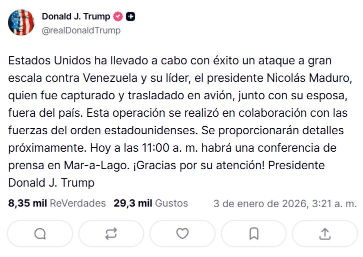 "Estados Unidos ha llevado a cabo con éxito un ataque a gran escala contra Venezuela y su líder, el presidente Nicolás Maduro, quien fue, junto a su esposa, capturado y sacado del país", afirmó Trump en su red Truth Social.
