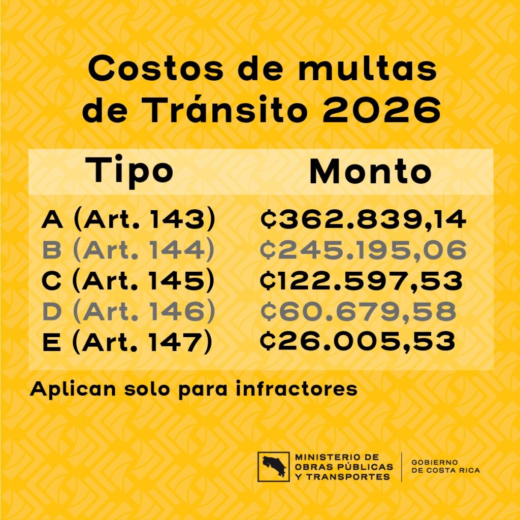En el caso de las multas de menor cuantía, como la violación a la restricción vehicular, el monto bajó de ₡26.062,87 a ₡26.005,53. En esta categoría también se incluyen faltas como no portar implementos obligatorios —por ejemplo, el extintor— o disminuir la velocidad para observar un accidente.