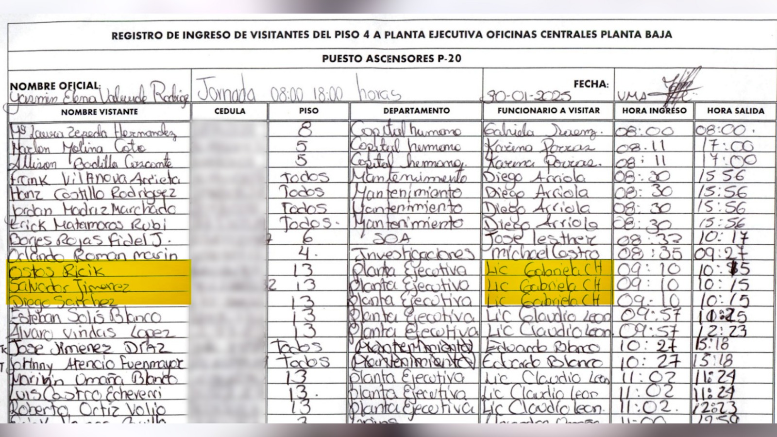 CR Hoy solicitó los ingresos de mayo del 2022 a la fecha y pudo corroborar que el 30 de enero del 2025 a las 9:10 a.m. ingresaron estas tres personas al edificio. Salieron de la reunión con la presidenta ejecutiva a las 10:15 a.m.