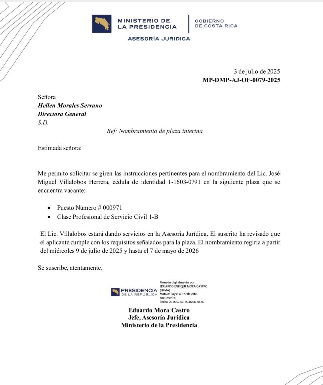 La directriz de contratación consta en un oficio al cual CR Hoy tuvo acceso y que aparece firmado por Eduardo Mora Castro, exjefe de Asesoría Jurídica del Ministerio de la Presidencia.