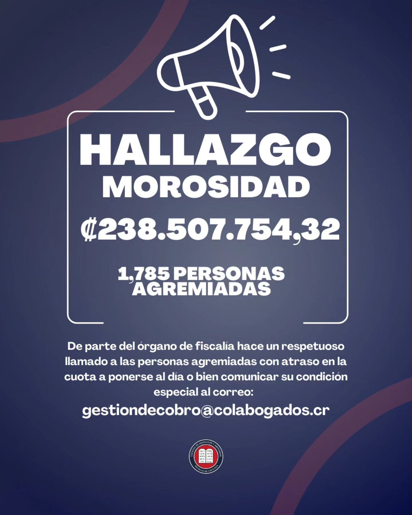 Quienes tengan algún atraso con las responsabilidades de pagos al Colegio pueden ponerse al día o si hay alguna razón especial por la que estén pendientes pueden comunicarlo al correo gestiondecobro@colabogados.cr.