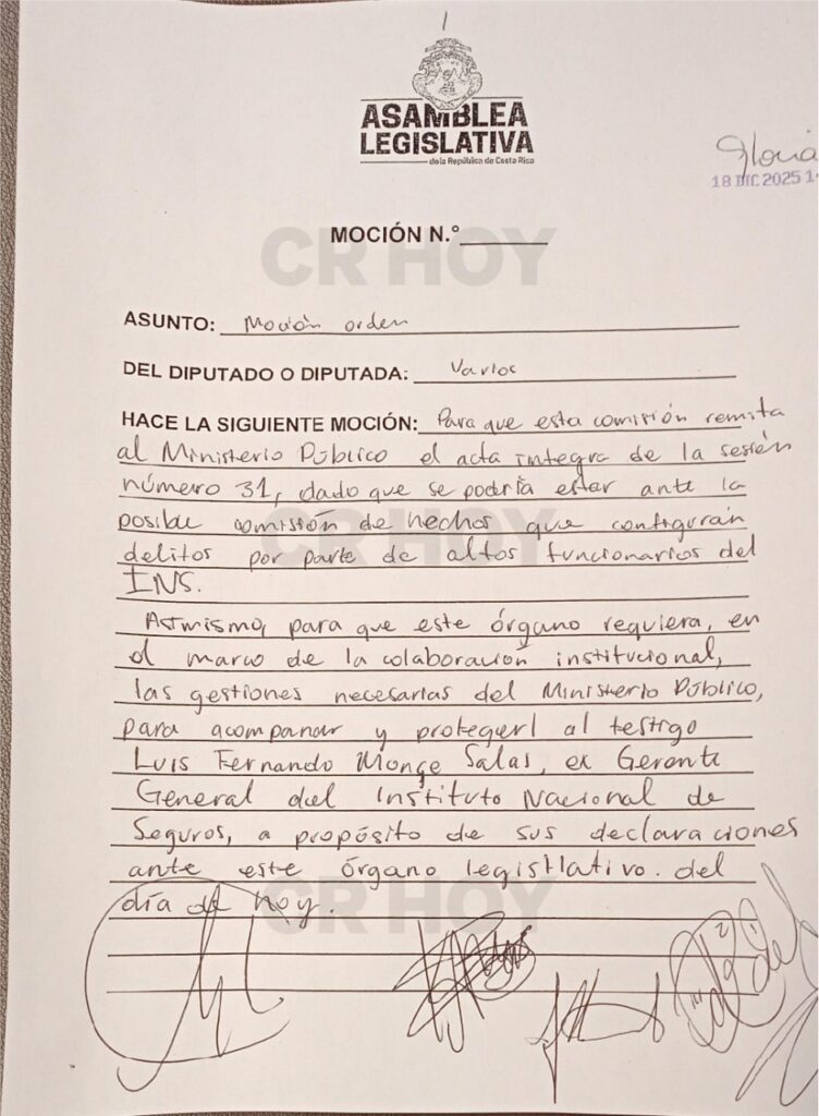 Los diputados de la Comisión de Ingreso y Gasto Público de la Asamblea Legislativa aprobaron una moción para remitir el acta íntegra de la sesión número 31 del foro legislativo, del pasado jueves 18 de diciembre, en la que el exgerente del Instituto Nacional de Seguros (INS), Luis Fernando Monge, reveló una serie de inconsistencias en la institución vinculadas con el intento de ingresar $10 millones al puesto de bolsa de la entidad (INS Valores), por parte de dos agentes de seguros, sin identificar.