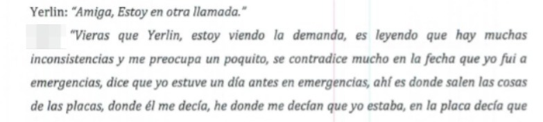 "(…) vieras Yerlin, que estoy viendo la demanda. Estoy leyendo que hay muchas inconsistencias y me preocupa un poquito, se contradice mucho en la fecha en que yo fui a emergencias, dice que yo estuve un día antes en emergencias (…).