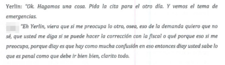 "Yerlin, viera que sí me preocupa lo otro, o sea, eso de la demanda quiero que usted me diga si se puede hacer la corrección con la fiscal o qué, porque eso sí me preocupa. Hay como mucha confusión en eso. Usted que sabe lo que es penal, como debe ir bien clarito todo", insistió la demandante.