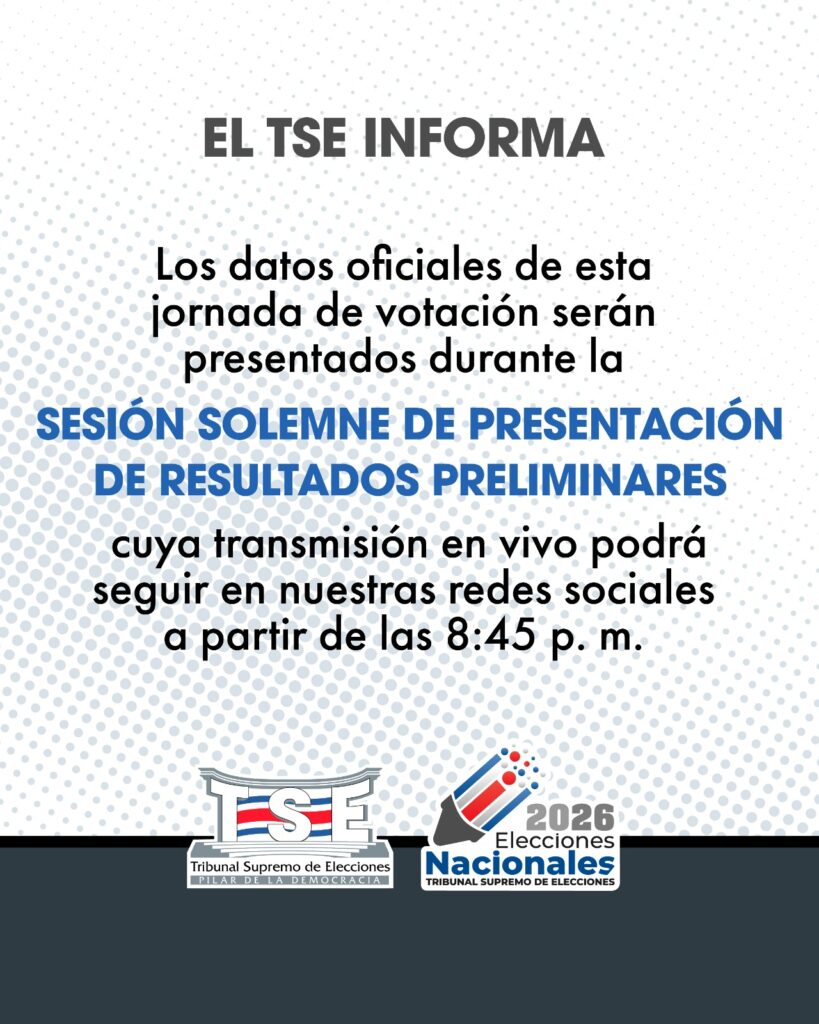 Según detalla el TSE, a eso de las 8:45 p.m. se dará a conocer el primer corte del conteo de mesas y estos resultados se podrán conocer por medio de la transmisión que hará el mismo Tribunal por medio de redes sociales.